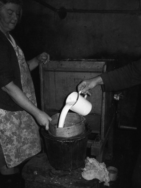 Hidlo'r llefrith cyn ei dollti i'r faeddau / Filter milk prior to pouring into butter churn. |
